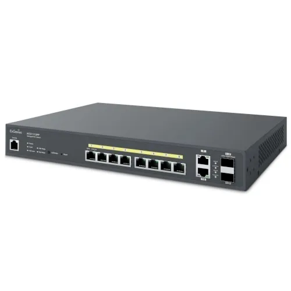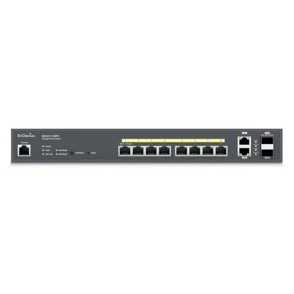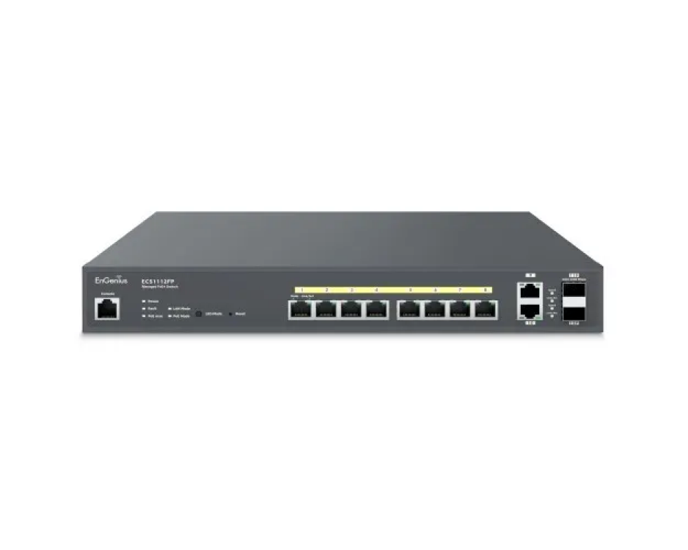 EnGenius Cloud ECS1112FP, an 8-Port Gigabit PoE+ Layer 2+ Switch with 130W Budget, 2 GbE and 2 Dual-Speed SFP ports for uplinks. Select Cloud or on-premises management options based on network architecture, administrative permissions, technical aptitude, or even budget. Enterprise-class features optimize network efficiency ensuring peak performance for SMBs