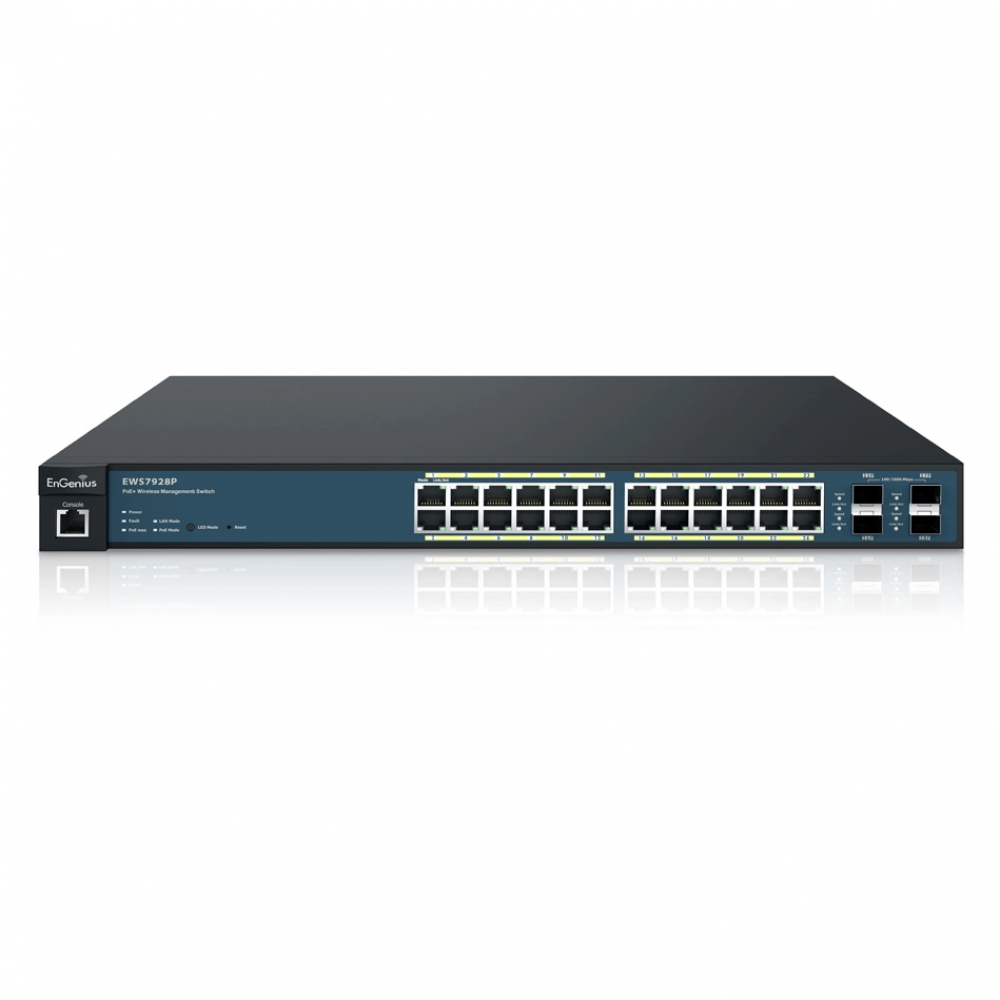 The EWS7928P Managed PoE+ 24 Port Gigabit Switch features simplified network configuration, monitoring, and management options along with an intuitive Web interface. Locally manage up to 50 EnSky APs and centrally manage wired and wireless networks via ezMaster. Power compatible PoE+ devices such as IP cameras, VoIP phones, and APs